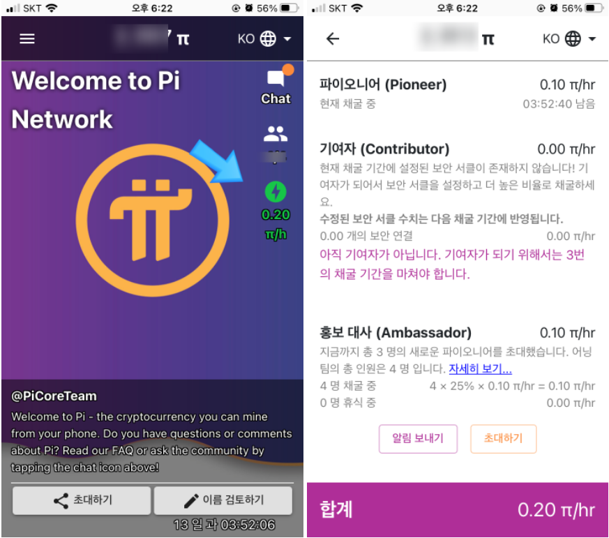 0.02 x 4명 = 시간당 0.1파이 채굴 가능합니다.